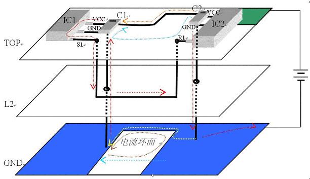 高速PCB中的信號(hào)回流及跨分割IC1為信號(hào)輸出端,IC2為信號(hào)輸入端(為簡(jiǎn)化PCB模型,假定接收端內(nèi)含下接電阻)第三層為地層。IC1和IC2的地均來(lái)自于第三層地層面。頂層右上角為一塊電源平面,接到電源正極。C1和C2分別為IC1、IC2的退耦電容。圖上所示的芯片的電源和地腳均為發(fā)、收信號(hào)端的供電電源和地