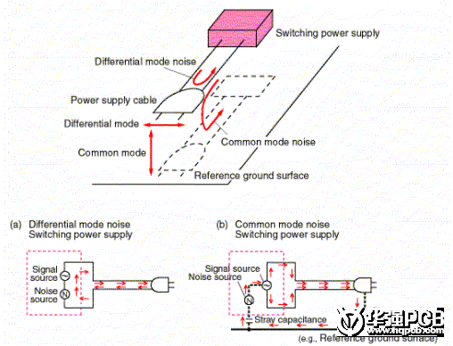 「傳導式EMI」可以分成兩類:差模(Differential mode;DM)和共模(Common mode;CM)。差模也稱作「對稱模式(symmetric mode)」或「正常模式(normal mode)」;而共模也稱作「不對稱模式(asymmetric mode)」或「接地泄漏模式(ground leakage mode)」。 由EMI產生的噪聲也分成兩類:差模噪聲和共模噪聲。簡言之,差模噪聲是當兩條電源供應線路的電流方向互為相反時發(fā)生的,如圖1(a)所示。而共模噪聲是當所有的電源供應線路的電流方向相同時發(fā)生的,如圖1(b)所示。一般而言,差模訊號通常是我們所要的,因為它能承載有用的數(shù)據(jù)或訊號;而共模訊號(噪聲)是我們不要的副作用或是差模電路的「副產品」,它正是EMC的最大難題。從圖一中,可以清楚發(fā)現(xiàn),共模噪聲的發(fā)生大多數(shù)是因為「雜散電容(stray capacitor)」的不當接地所造成的。這也是為何共模也稱作「接地泄漏模式」的原因。