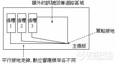 一個(gè)穩(wěn)固的平面會(huì)產(chǎn)生共模的輻射。由于共同的部份電感可以降低具輻射性的射頻電流的產(chǎn)生,因此,共同的部份電感也會(huì)影響到差模電流和共模電流。而利用映像平面是可以將這些電流大幅地降低的。理論上,差模電流應(yīng)該等于零,但實(shí)際上它無法100%被消除,而剩下來的差模電流會(huì)轉(zhuǎn)變成共模電流。此共模電流正是造成電磁干擾的主要來源。因?yàn)樵诨貍髀窂缴系氖S嗟纳漕l電流,被加到在訊號路徑中的主電流(I1)中,造成訊號嚴(yán)重干擾。為了降低共模電流,我們必須將走線平面和映像平面之間的共同的部份電感值增加至最大,以補(bǔ)捉磁通量,藉此消除不需要的射頻能量。差模電壓和電流會(huì)產(chǎn)生共模電流,而減少差模電流的方法除了增加共同的部份電感值以外,走線平面和映像平面之間的距離也必須最小。在PCB內(nèi),當(dāng)有一個(gè)射頻回傳平面或路徑存在時(shí),若此回傳路徑被連接至一個(gè)參考源,則可以獲得最佳的性能。對TTL和CMOS而言,其芯片內(nèi)的功率和接地腳位是連接至參考源、電源、接地平面。只有當(dāng)射頻回傳路徑有和芯片內(nèi)的功率和接地腳位連接,一個(gè)真正的映像平面才會(huì)存在。通常,在芯片內(nèi)會(huì)有接地線路,此線路與PCB的接地平面連接,因此產(chǎn)生良好的映像平面。如果將此映像平面移除,則在走線和接地平面之間會(huì)產(chǎn)生「虛幻的」映像平面。由于走線之間的距離很小,輻射能量會(huì)降低,因此,射頻映像(RF image)會(huì)被抵銷。理想的映像平面應(yīng)該是無限大的,而且沒有分裂、細(xì)縫或割痕。接地和訊號回路 由于回路是射頻能量傳播最主要的媒介,因此,接地或訊號回傳回路控制(return loop control)是抑制PCB內(nèi)的電磁干擾的最重要設(shè)計(jì)考慮之一。高速的邏輯組件和振蕩器應(yīng)該盡量靠近接地電路,以避免形成回路;在此回路中會(huì)有渦流(eddy current)存在,此時(shí)是以機(jī)殼或底座(chassis)接地。渦流是受到不斷變化的磁場感應(yīng)產(chǎn)生的,它通常是寄生的。附圖五是PC的適配卡插槽和單點(diǎn)接地所形成的回路。在此圖中,有一個(gè)額外的訊號回傳回路區(qū)域存在。每個(gè)回路將會(huì)各別產(chǎn)生一個(gè)不同的電磁場和頻譜。射頻電流將會(huì)在特定的頻率下,產(chǎn)生電磁輻射場,其輻射能量的大小和回路的面積有關(guān)。這時(shí)必須使用遮蔽物(containment),以避免射頻電流耦合至其它電路中;或輻射至外部環(huán)境,造成電磁干擾。不過,最好能盡量避免由內(nèi)部電路產(chǎn)生射頻回路電流(RF loop current)來。