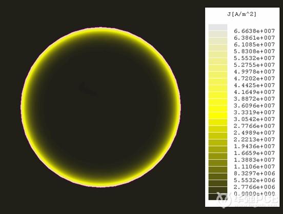 我們知道,電感的定義是指圍繞在電流周?chē)拇帕€(xiàn)匝數(shù)。電感隨頻率減小,直覺(jué)告訴我們一定是導(dǎo)線(xiàn)中電流分布發(fā)生了變化。到這里我想各位網(wǎng)友應(yīng)該豁然開(kāi)朗了。趨膚效應(yīng)(skin effect)你一定不會(huì)陌生??纯聪旅娴倪@張圖你會(huì)有更直觀(guān)的感受,這是用二維場(chǎng)求解器仿真出來(lái)的高頻時(shí)導(dǎo)體中電流的分布。黃色部分是電流所在位置。
