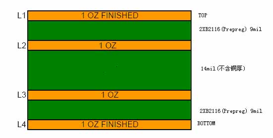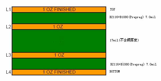 由于精細(xì)線路的迅速發(fā)展,薄銅箔已得到大量的發(fā)展并被全面使用,銅箔厚度已由早些年的1OZ走向1/2OZ為主,而且早也開發(fā)出1/3OZ和1/4OZ,甚至更薄的如1/7OZ銅箔。因?yàn)檩^薄的銅箔厚度有利于制造和控制導(dǎo)線寬度及導(dǎo)線的完整性,從而有利于保證阻抗控制精度。由于客戶對外層銅厚要求為1OZ, 因此,對于該四層板壓合時外層我們選用了1/3OZ 銅箔進(jìn)行壓合,再經(jīng)過后面的電鍍后即可達(dá)到客戶表面銅厚1OZ的銅厚要求,這樣既滿足了客戶表面完成銅厚的要求,又有利于蝕刻時對導(dǎo)線寬度均勻性的控制