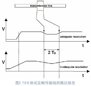 當(dāng)傳輸線上出現(xiàn)阻抗不連續(xù)的現(xiàn)象時(shí),在阻抗變化的地方階躍信號就會產(chǎn)生反射的現(xiàn)象,如果將反射信號進(jìn)行取樣并顯示在示波器的屏幕上,就會得出如圖2所示的波形,從波形中我們可以看出一條被測試的傳輸線在不同位置上的阻抗變化。同時(shí)我們可以比較圖2中的兩個(gè)波形。這是使用兩臺分辨率不同的TDR設(shè)備在測試同一條傳輸線時(shí)獲得的測試結(jié)果。對于傳輸線阻抗變化的反映一個(gè)明顯而另一個(gè)不明顯。TDR設(shè)備感知傳輸線阻抗不連續(xù)的分辨率取決于TDR設(shè)備所發(fā)出的階躍信號上升時(shí)間的快慢,上升時(shí)間快所獲得的分辨率就高。而TDR設(shè)備的上升時(shí)間往往和測試系統(tǒng)的帶寬緊密相關(guān),帶寬高的測試系統(tǒng)有更快的上升時(shí)間。
