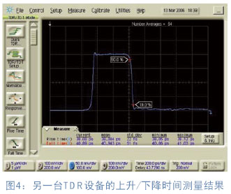 圖4是另一臺TDR設(shè)備的系統(tǒng)上升/下降時(shí)間的測試結(jié)果,系統(tǒng)的上升/下降時(shí)間在38ps~40ps之間??梢姴煌腡DR設(shè)備在系統(tǒng)上升/下降時(shí)間上是有很大的區(qū)別的,由此帶來的就是傳輸線阻抗測試分辨率的很大不同。