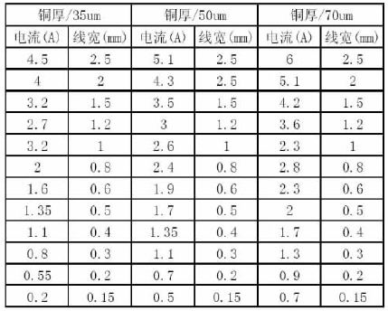 PCB導(dǎo)線寬度與電路電流承載值有關(guān),一般導(dǎo)線越寬,承載電流的能力越強(qiáng)。在實(shí)際的PCB制作過程中,導(dǎo)線寬度應(yīng)以能滿足電氣性能要求而又便于生產(chǎn)為宜,它的最小值以承受的電流大小而定,導(dǎo)線寬度和間距可取0.3mm(12mil)。導(dǎo)線的寬度在大電流的情況下還要考慮其溫升問題。PCB設(shè)計(jì)銅鉑厚度、線寬和電流關(guān)系表1所示。