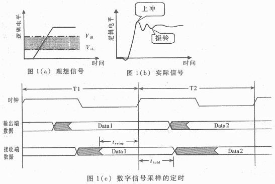 信號完整性SI(Signal Integrity)涉及傳輸線上的信號質(zhì)量及信號定時的準確性。在數(shù)字系統(tǒng)中對于邏輯1和0,總有其對應(yīng)的參考電壓,正如圖1(a)中所示:高于ViH的電平是邏輯1,而低于ViL的電平視為邏輯0,圖中陰景域則可視為不確定狀態(tài)。而由圖1(b)可知,實際信號總是存在上沖、下沖和振鈴,其振蕩電平將很有可能落入陰影部分的不確定區(qū)。信號的傳輸延遲會直接導(dǎo)致不準確的定時,如果定時不夠恰當,則很有可能得到不準確的邏輯。例如信號傳輸延遲太大,則很有可能在時鐘的上升沿或下降沿處采不到準確的邏輯。一般的數(shù)字芯片都要求數(shù)據(jù)必須在時鐘觸發(fā)沿的tsetup前即要穩(wěn)定,才能保證邏輯的定時準確(見圖1(c))。對于一個實際的高速數(shù)字系統(tǒng),信號由于受到電磁干擾等因素的影響,波形可能會比我們想象中的更加糟糕,因而對于tsetup的要求也更加苛刻,這時,信號完整性是硬件系統(tǒng)設(shè)計的一個至關(guān)重要的環(huán)節(jié),必須加以認真對待。