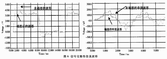 第三點是解決信號的反射、串擾噪聲問題。這一點在一高速系統(tǒng)中顯得尤其重要,解決的辦法是通過采用先進的EDA工具,選擇正確的布線策略和端接方式,從而得到的理想的信號波形。在設(shè)計本系統(tǒng)時,基于IBIS模型,使用Hyperlynx進行設(shè)計前仿真。根據(jù)仿真結(jié)果,選擇出最優(yōu)的布線策略。圖6為端接和未加端接的信號波形及串擾波形圖,從圖中可以看到端接對消除反射、振蕩和串擾到了明顯的作用。