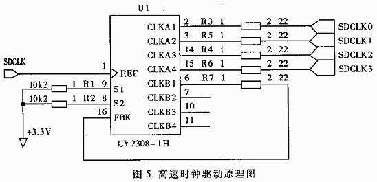 其次是對系統(tǒng)中高速時鐘信號與關(guān)鍵信號進行完整性設(shè)計。與SBSRAM接口的時鐘高達16MHz,與SDRAM接口的時鐘高達80MHz,時鐘信號傳輸處遲大小和信號質(zhì)量的優(yōu)劣將直接關(guān)系到系統(tǒng)的定時是滯準確。在設(shè)計布局布線時,總是優(yōu)考慮這些重要的時鐘線,即通過規(guī)劃時鐘線,使得時鐘線的連線遠離其它的信號線;連線盡量短,并且加上地線保護。本系統(tǒng)中由于要求大量存儲器(使用了4片SDRAM),對于要求較高的同步時鐘來說,如果采用星型布線,就很難保證時鐘的扇出能力,而且還將導(dǎo)致PCB布線尺寸的增大,從而直接影響信號完整性。因此很有必要采用時鐘緩沖器來產(chǎn)生4個同相的、延遲極小且一致的時鐘,分別接到4片SDRAM上,這樣不但增加了時鐘信號的驅(qū)動能力,同時秀好地保證了信號完整性(如圖5的所示)。對于其它的關(guān)鍵信號諸如FIFO的讀寫信號等,也應(yīng)盡心設(shè)計。