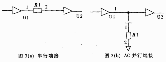 有時候在PCB板尺寸要求很苛刻的情況下,未必能夠保證并行線間的足夠空間,因此要適當改變布線策略,盡可能地保護比較重要的信號線,并依靠端接來大幅度地消除串擾?;诓煌牟季€拓撲結(jié)構(gòu),端接的策略也可能不同,主要有以下三種方式:單贈載網(wǎng)絡(luò)一般采用串行端接;菊花鏈結(jié)構(gòu)一般采用AC并行端接;星形布線一般也采用AC并行端接(如圖3所示)。