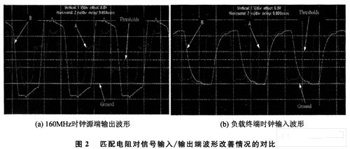 圖2(a)是沒有加入匹配電阻的情況,可以明顯看到輸出端A的波形有一個大的下沖(大約1 V左右),而且波形最大幅度已經(jīng)達到4 V(I/O信號是3.3 V),有很明顯的反射迭加現(xiàn)象。輸入端B的波形相當不好,由于反射造成的波形下沖和過沖點的信號幅值已經(jīng)接近門檻電平,這樣的時鐘信號很容易造成觸發(fā)器的錯誤操作。圖2(b)是在靠近源輸出端加入了一個47 Ω的匹配電阻后的波形,可以看到A和B的波形都有了明顯的改善。