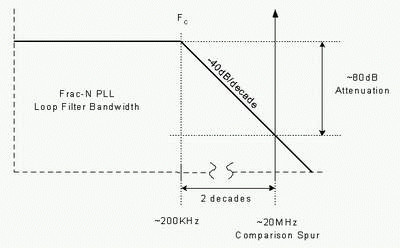 圖5給出了一種假設(shè)的情況,假設(shè)設(shè)計(jì)中采用了一個具有20MHz相對頻率的N分頻合成器,如果環(huán)路濾波器是二階的,截止頻率為200kHz,滾降速率通常為40dB/decade,在20MHz頻點(diǎn)可以獲得80dB的衰減。如果參考雜散成分為-40dBc(假設(shè)可以導(dǎo)致有害的調(diào)制分量的電平),產(chǎn)生雜散的機(jī)制可能超出環(huán)路濾波器的作用范圍(如果它是在濾波器之前產(chǎn)生的,其幅度可能非常大)。壓縮環(huán)路濾波器的帶寬將不會改善雜散特性,反而提高了PLL鎖相時間,對系統(tǒng)產(chǎn)生明顯的負(fù)面影響。