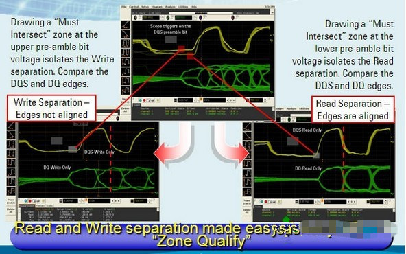 使用InfiniiScan是一種較好的方法,它使用畫圖式的圖形觸發(fā)分離出讀和寫,然后再累積成眼圖,可以累積大量的數(shù)據(jù),然后再測(cè)試建立時(shí)間、保持時(shí)間和其他參數(shù),分離方法如下圖: