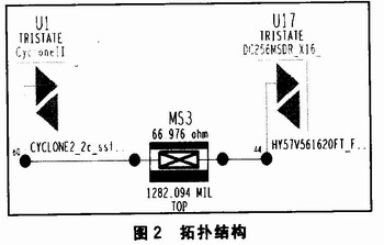 發(fā)射端為HY57V561620的44引腳,接收端為Cyclone II的60引腳,激勵(lì)為66 MHz的方波。圖2為拓?fù)浣Y(jié)構(gòu),圖3為仿真波形。