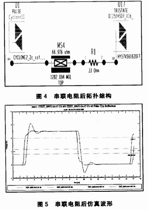 由仿真波形可以看出,由信號(hào)反射引起了波形畸變,產(chǎn)生了明顯的振鈴現(xiàn)象。振鈴現(xiàn)象的存在,使信號(hào)多次跨越電平邏輯門限從而導(dǎo)致邏輯功能紊亂。減小振鈴噪聲的一種有效手段是在電路中串聯(lián)一個(gè)小電阻,該電阻為電路提供了阻尼,能顯著減小振鈴幅度,縮短振鈴震蕩時(shí)間,同時(shí)幾乎不影響電路速度。在工程使用上,該電阻通常為33 Ω。串聯(lián)電阻后的拓?fù)浣Y(jié)構(gòu)和仿真波形如圖4和圖5所示。